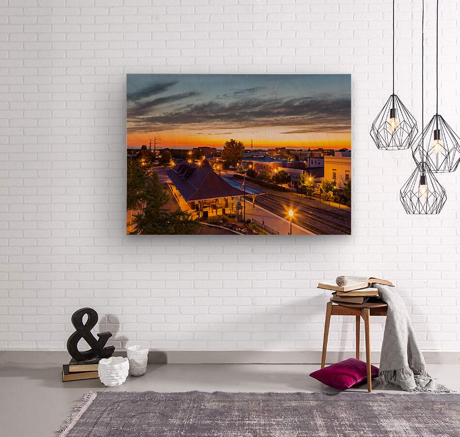 Evening view of Manassas Railway station and town at sunset as the lights in the town come on