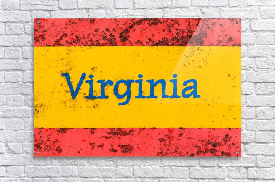 Detail of the word Virginia on a newspaper stand that is brightly painted but starting to rust