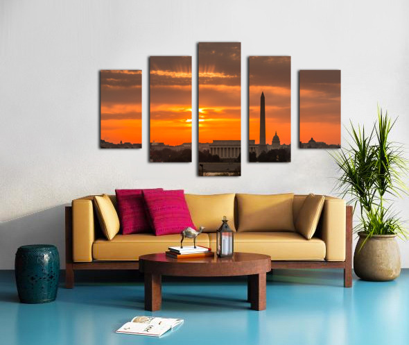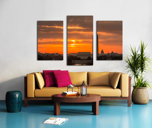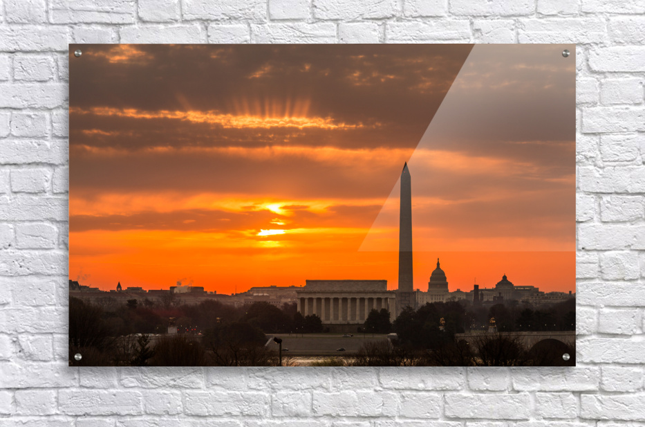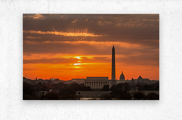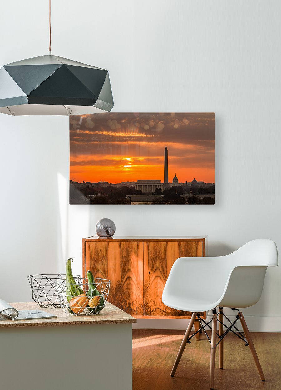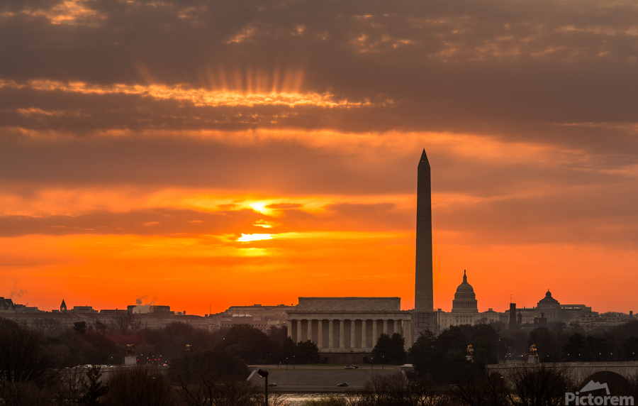 ABOUT THIS ARTWORK: FIERY SUNRISE OVER MONUMENTS OF WASHINGTON