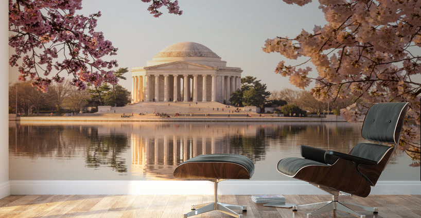 Sun rising illuminates the Jefferson Memorial and Tidal Basin with bright pink cherry blossoms framing the monument