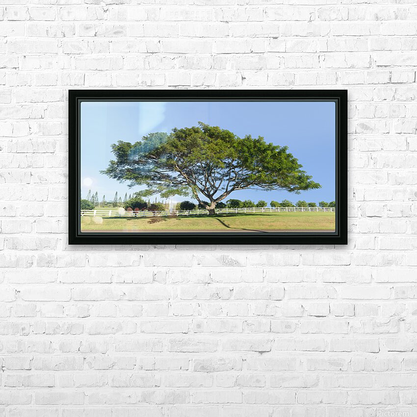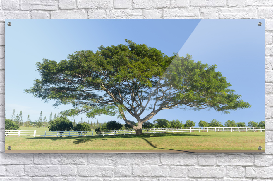 Large wide acacia or koa tree in front of white picket fence and orchard on Hawaiian island of Kauai. High resolution stitched image