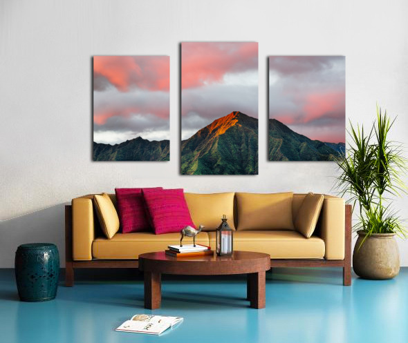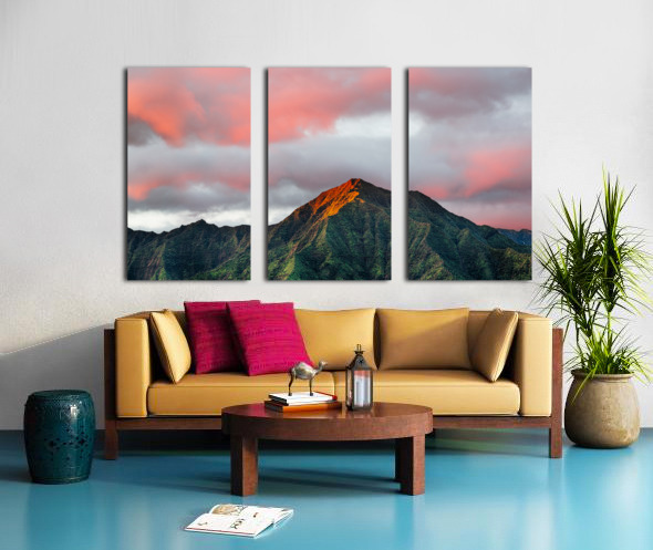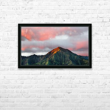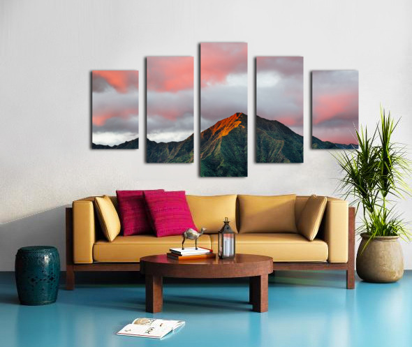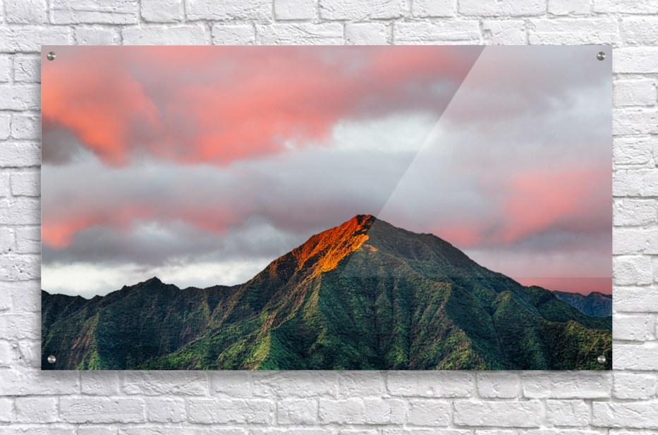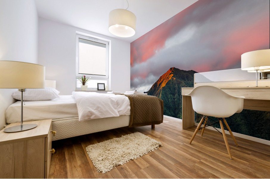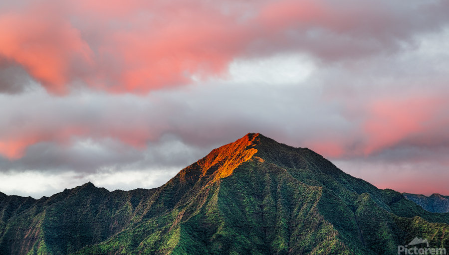 Mountains of the Na Pali mountain range in the distance above Hanalei Bay in Kauai. Taken just after dawn with the sun just skimming the peaks of the mountains and illuminating the clouds with a brilliant red light