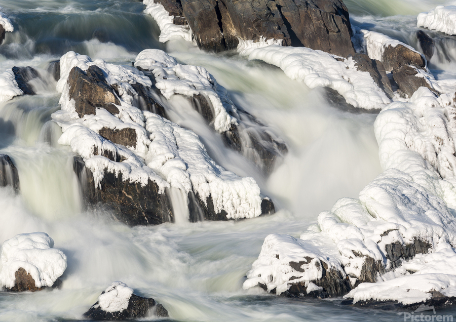 Great Falls on Potomac river outside Washington DC in winter with ice forming on the cascades and snow on the rocks