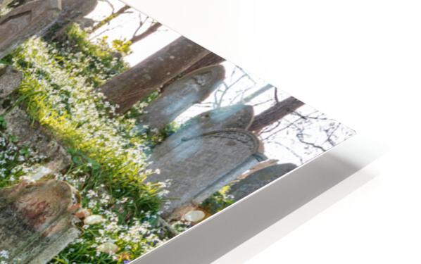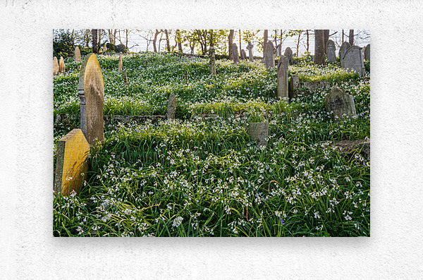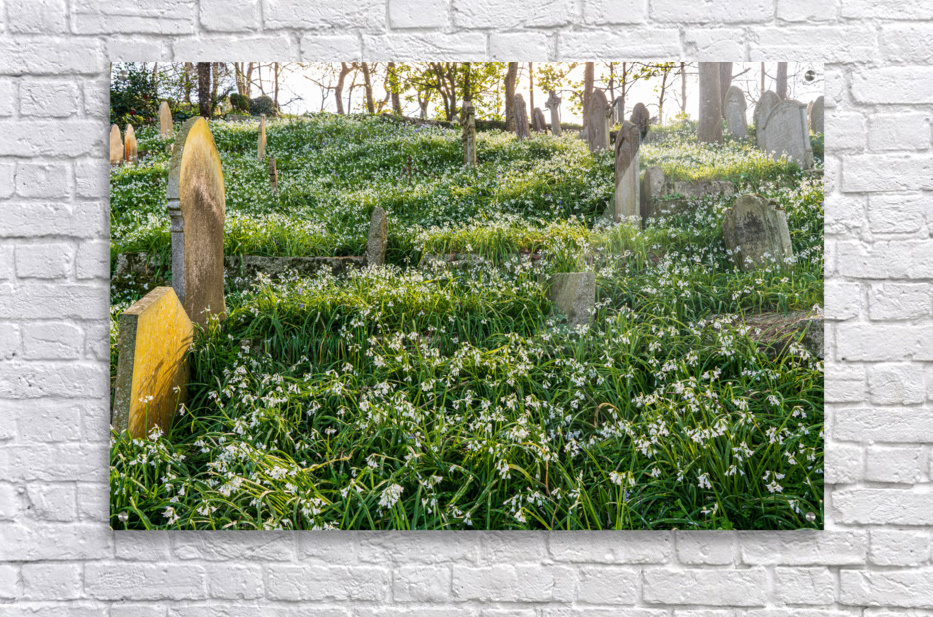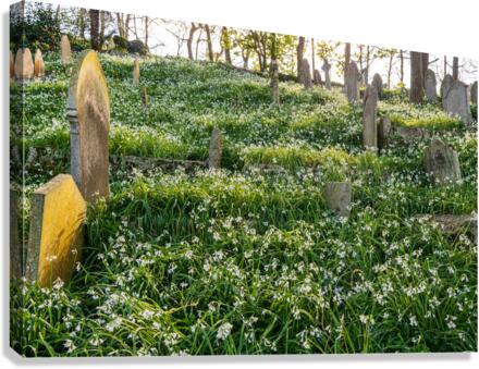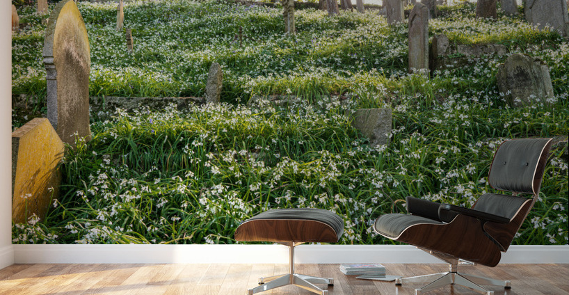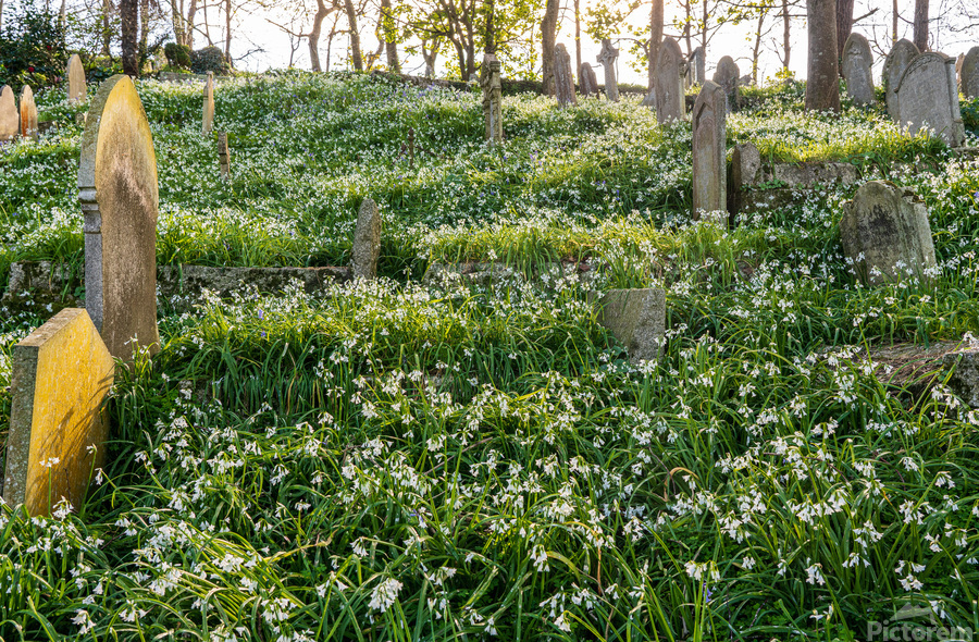 Headstones on the hillside among white bluebells at the little parish church of St Just in Roseland Cornwall