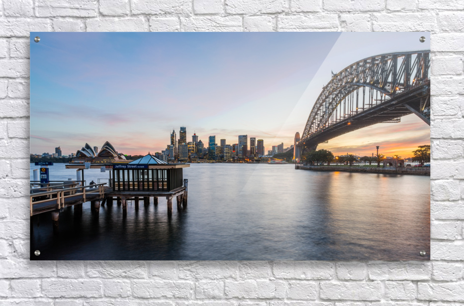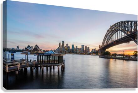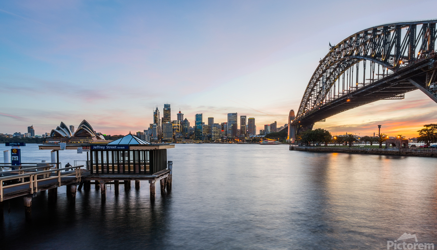Dramatic widescreen panoramic image of the city of Sydney at sunset with Jeffrey Street ferry stop in foreground. Includes the Rocks Bridge Opera Hous...[+]