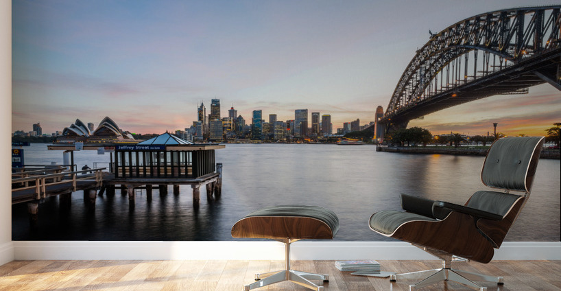 Dramatic widescreen panoramic image of the city of Sydney at sunset with Jeffrey Street ferry stop in foreground. Includes the Rocks Bridge Opera House and a broad view of CBD and the water in the harbour