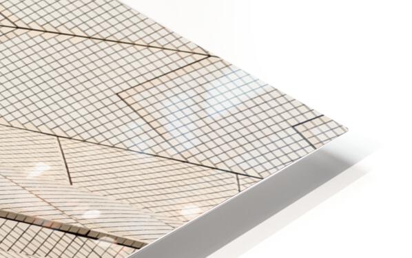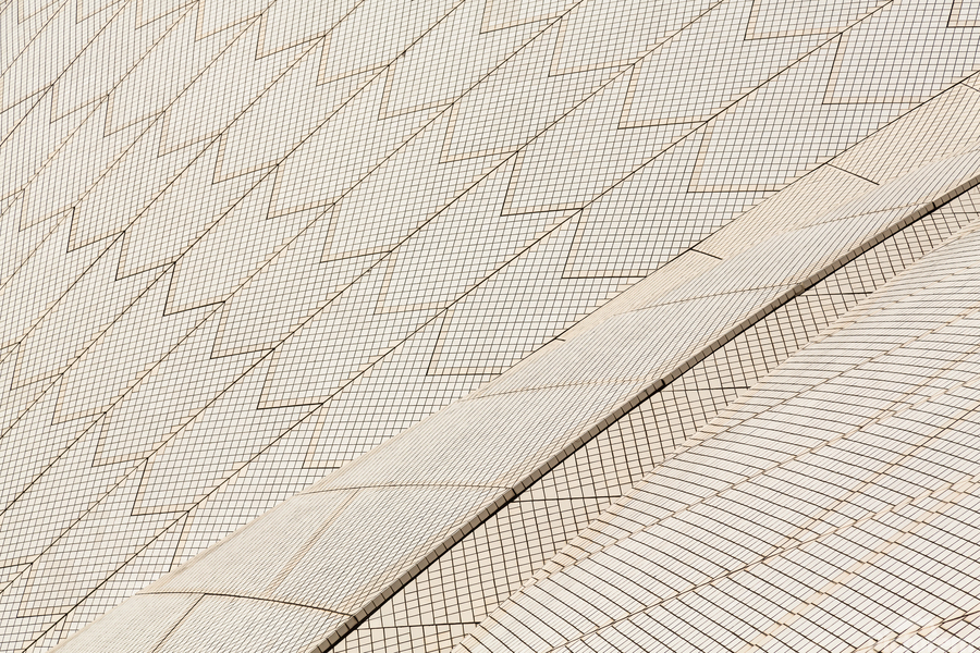 Detailed view of the sail like buildings of the Sydney Opera House in Australia with a focus on the tiles on the roof of the modern building