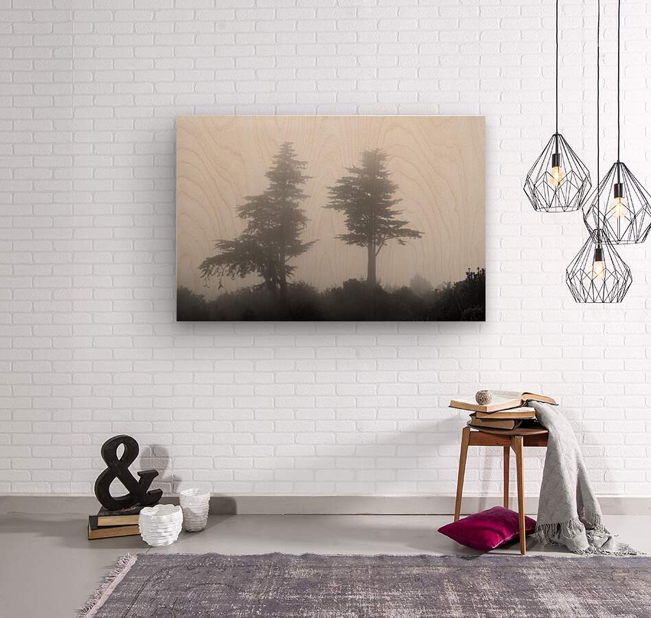 Get this artwork "Mist and fog envelop two pine trees" in a framed print.