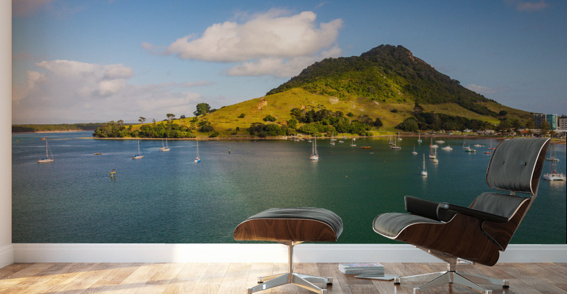 Bay and harbour at Tauranga with yachts and boats in the blue calm water in front of the Mount