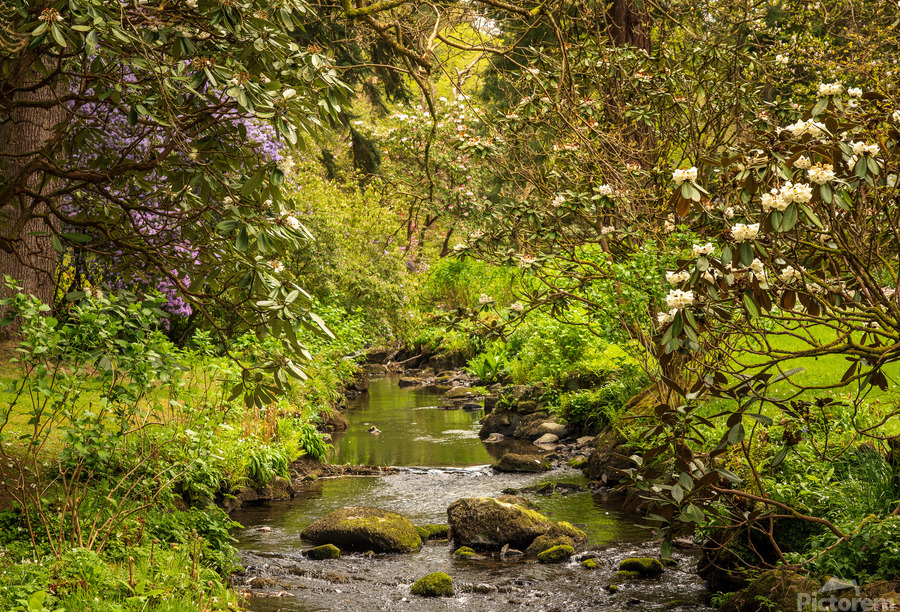 Get this artwork "Azaleas and Rhododendron trees surround stream in spring" in a framed print.