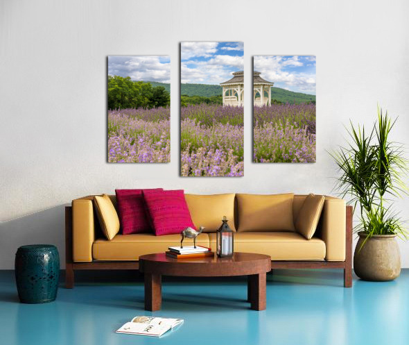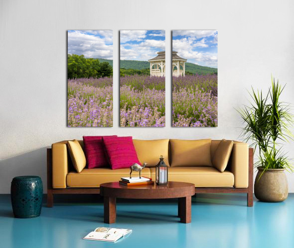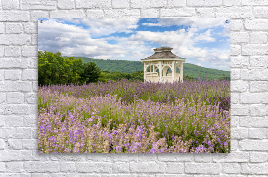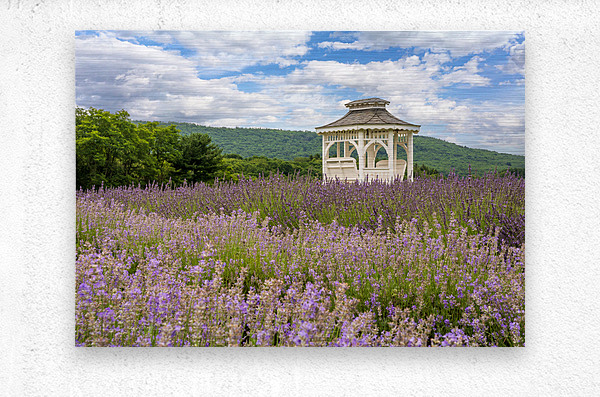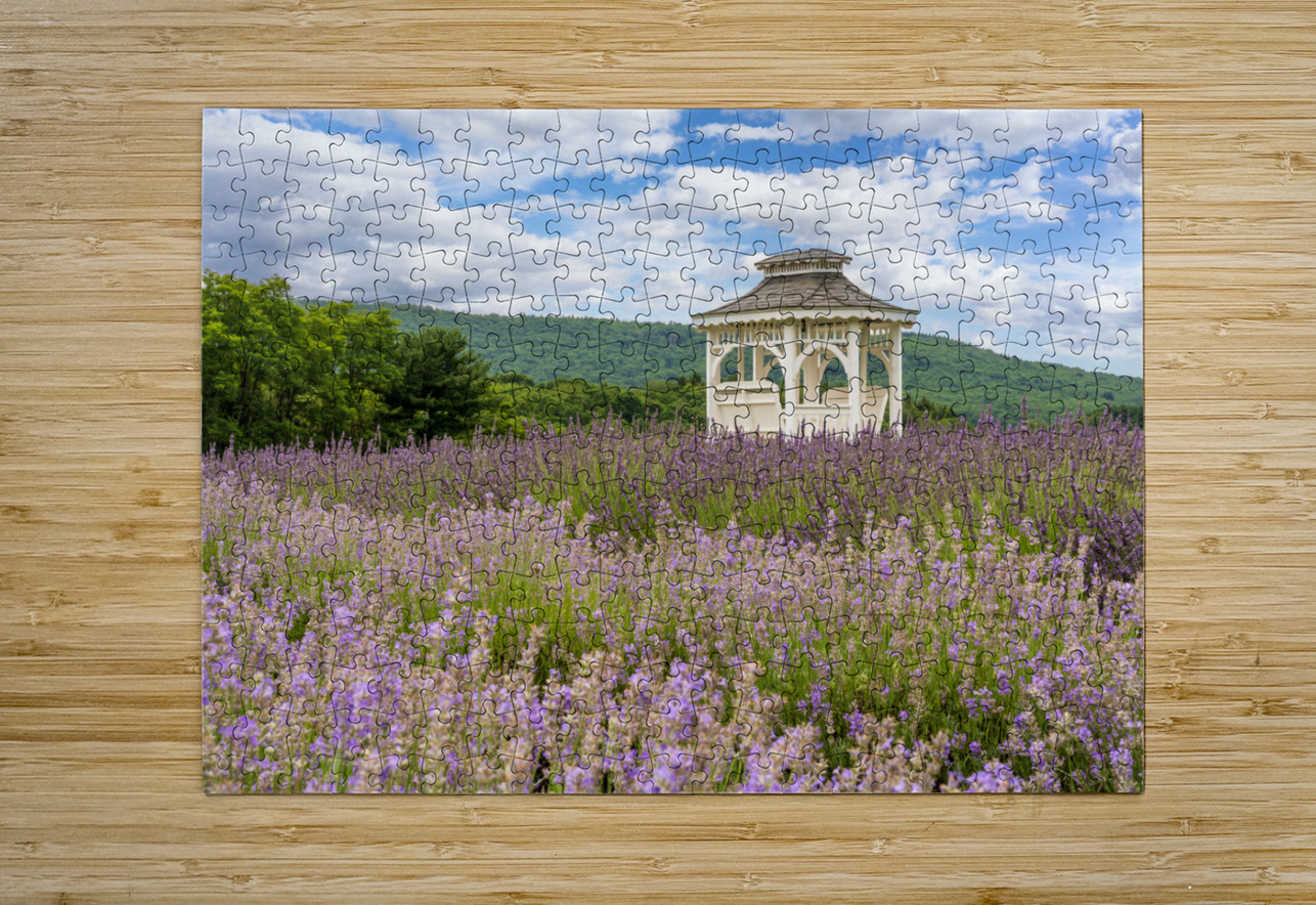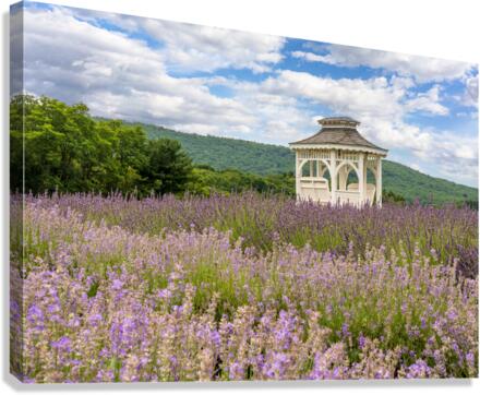 Lavender plants in blossom cultivated in a small farm in Maryland with white gazebo offering shade and relaxation