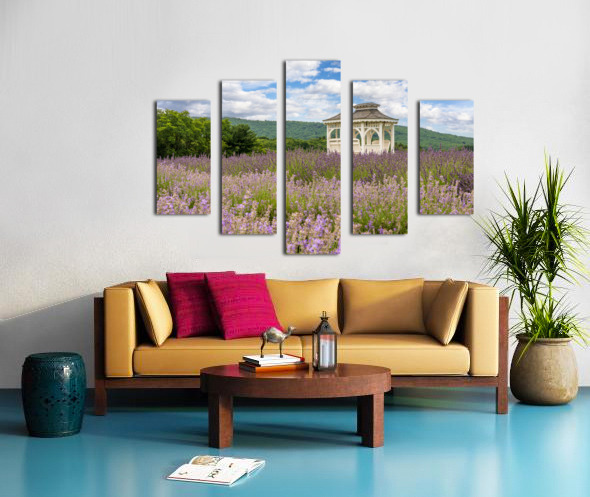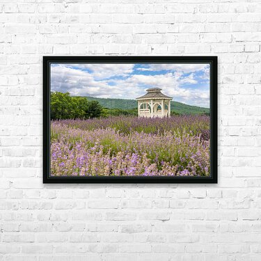 Lavender plants in blossom in early July with building Picture Frame Printing