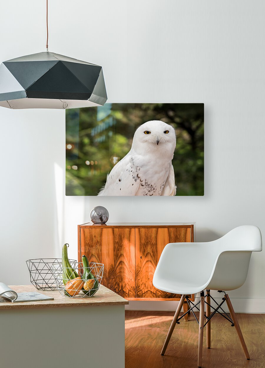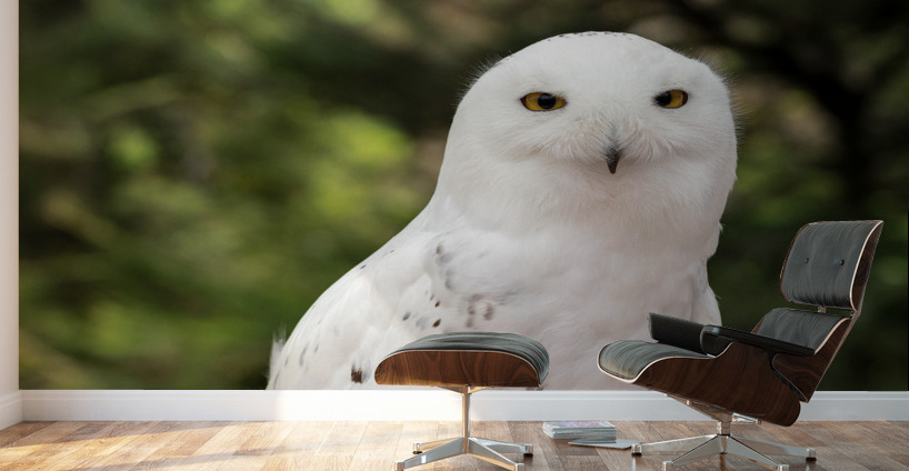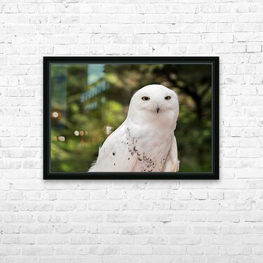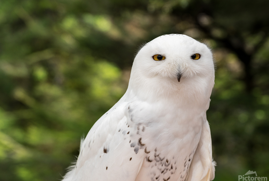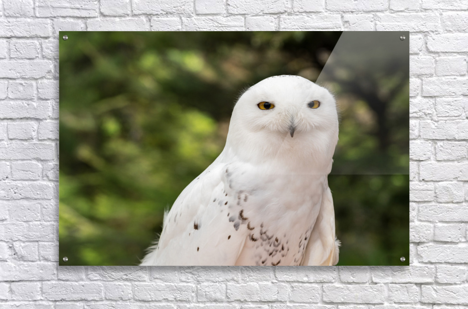 Close up of Snowy Owl against green rainforest in summer Frame print