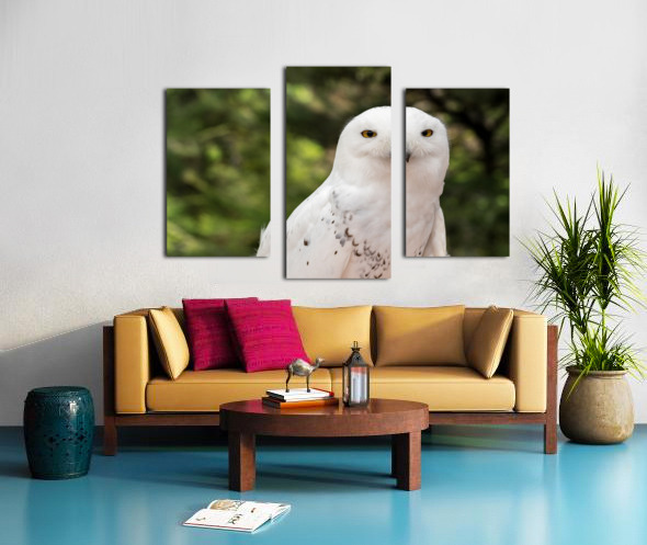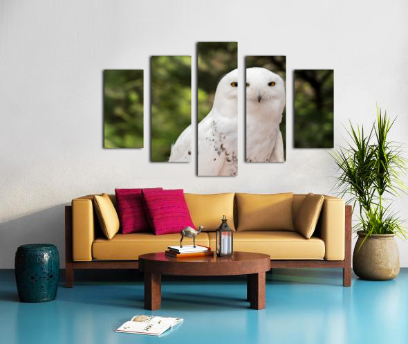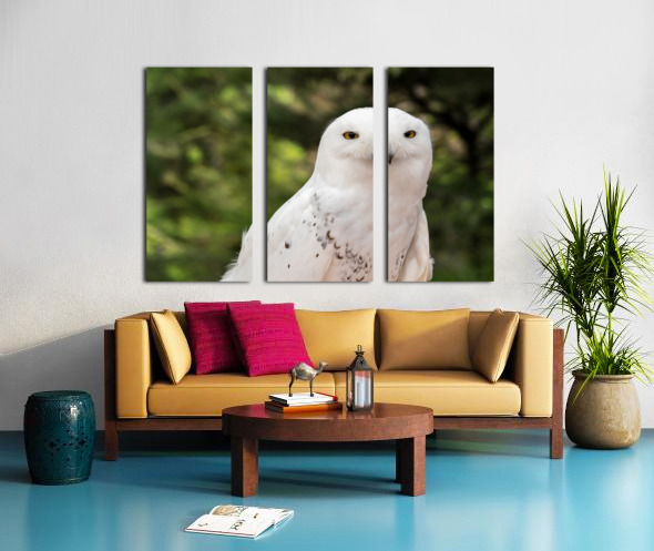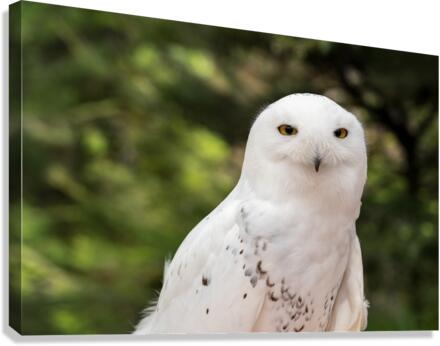 Close up of Snowy Owl against green rainforest in summer Canvas print