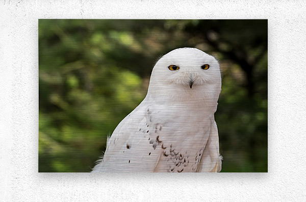 ABOUT THIS ARTWORK: CLOSE UP OF SNOWY OWL AGAINST GREEN RAINFOREST IN SUMMER