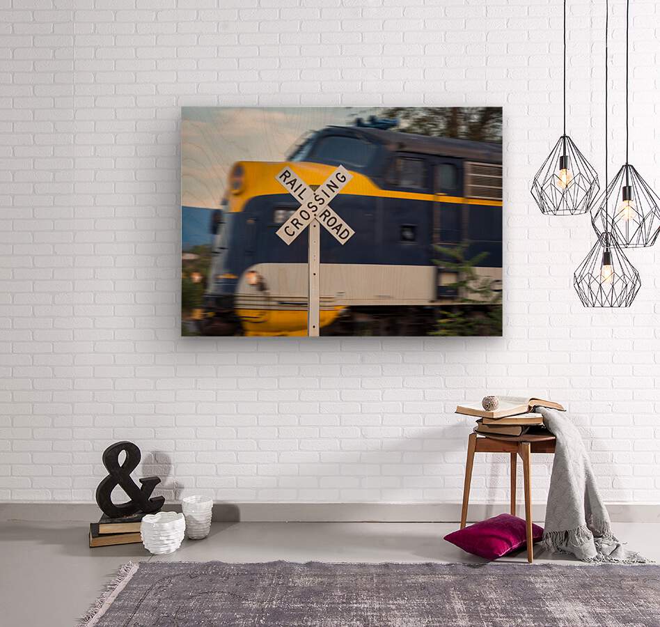 Get this artwork "Diesel engine with railroad crossing sign" in a framed print.