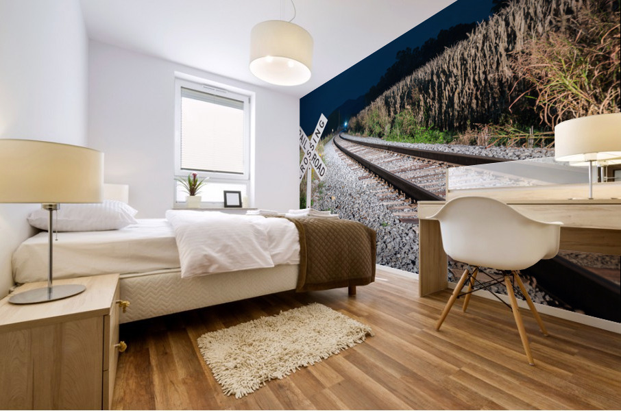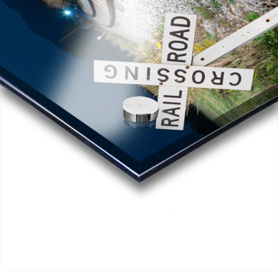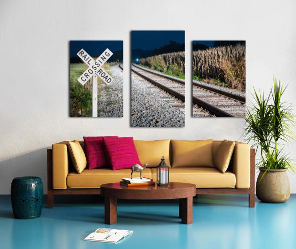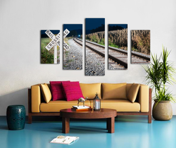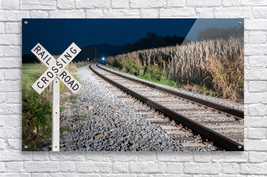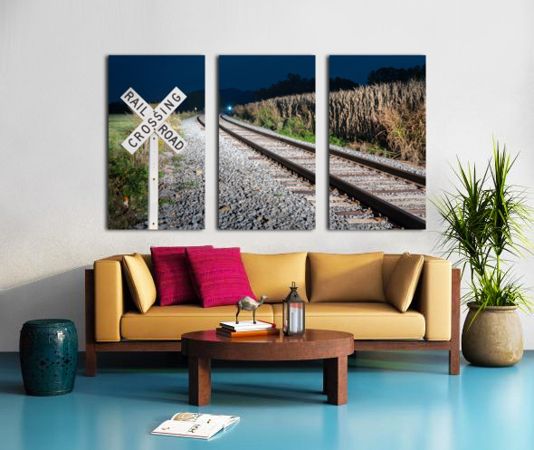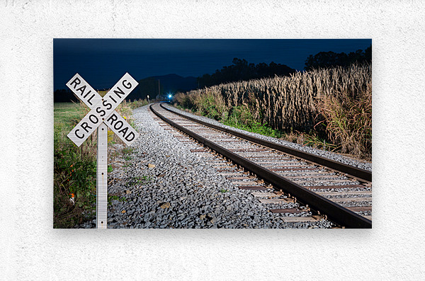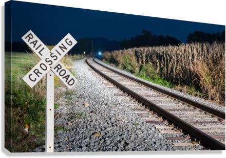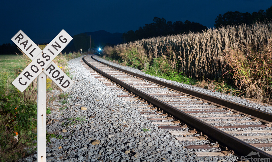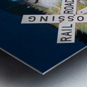 Get this artwork "Oncoming train with railroad crossing sign" in a framed print.