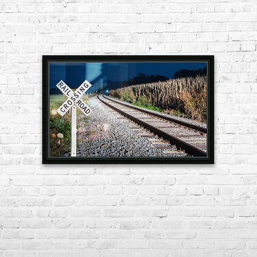 Oncoming train with railroad crossing sign Frame print