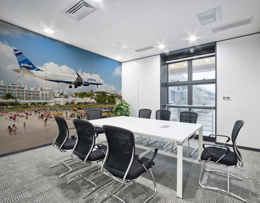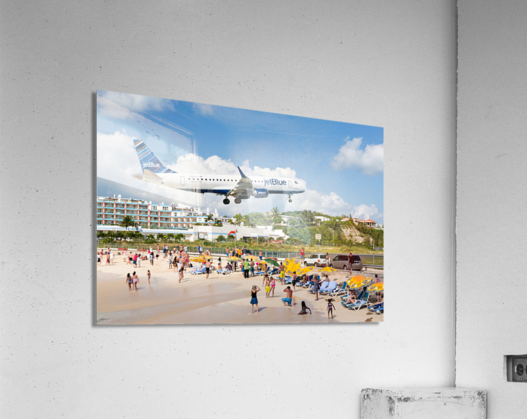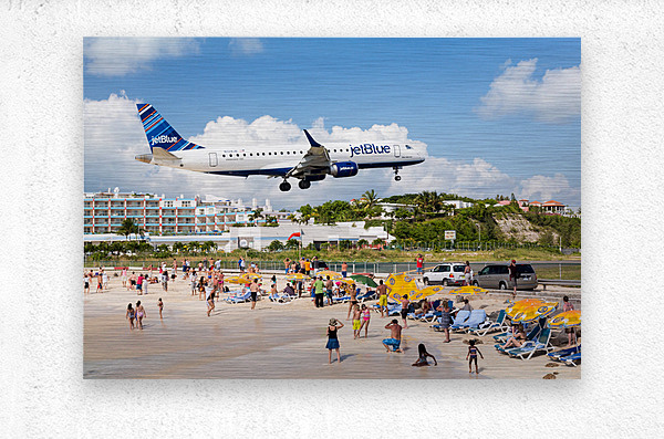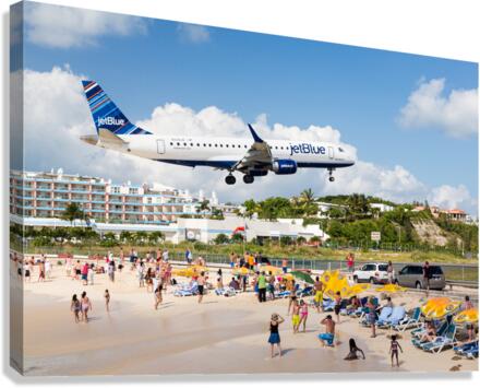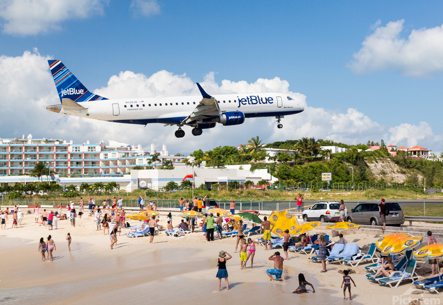 ABOUT THIS ARTWORK: JET BLUE AIRPLANE LANDS AT PRINCESS JULIANA AIRPORT ST MARTIN