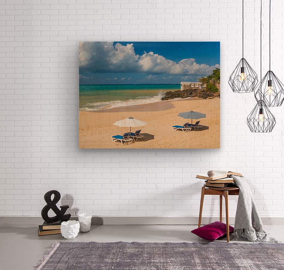 Reclining chairs and umbrella on Baie Rouge Picture Frame Printing