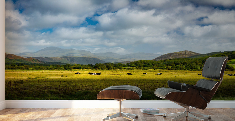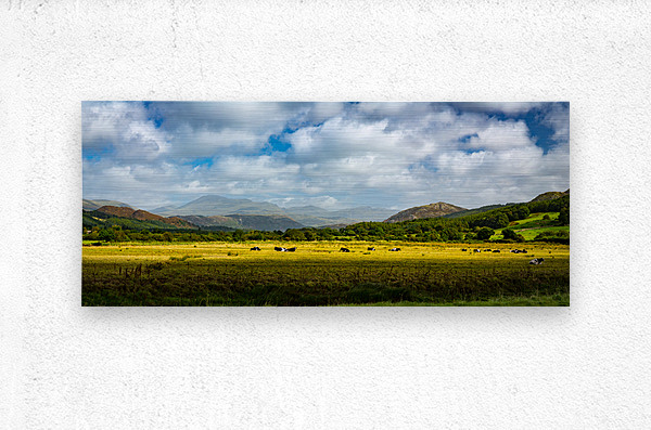 Panoramic view of meadows and pastures approaching the edge of English Lake District in England