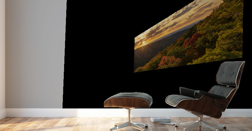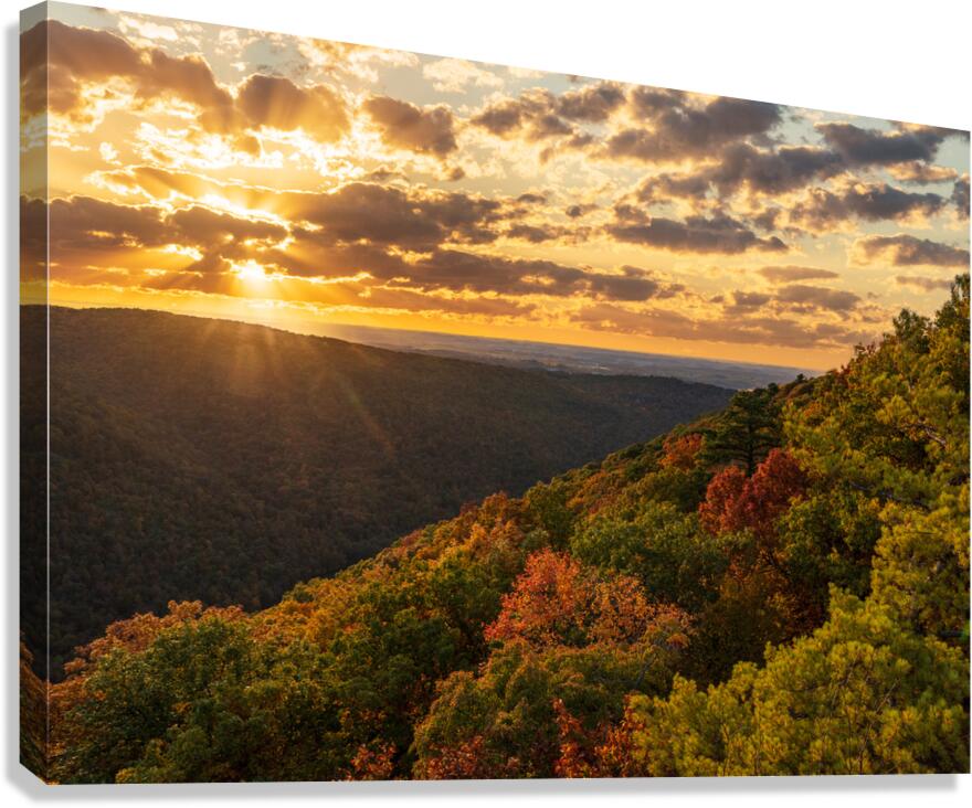 Sun setting behind clouds illuminating the fall colors of the trees in Coopers Rock State Forest