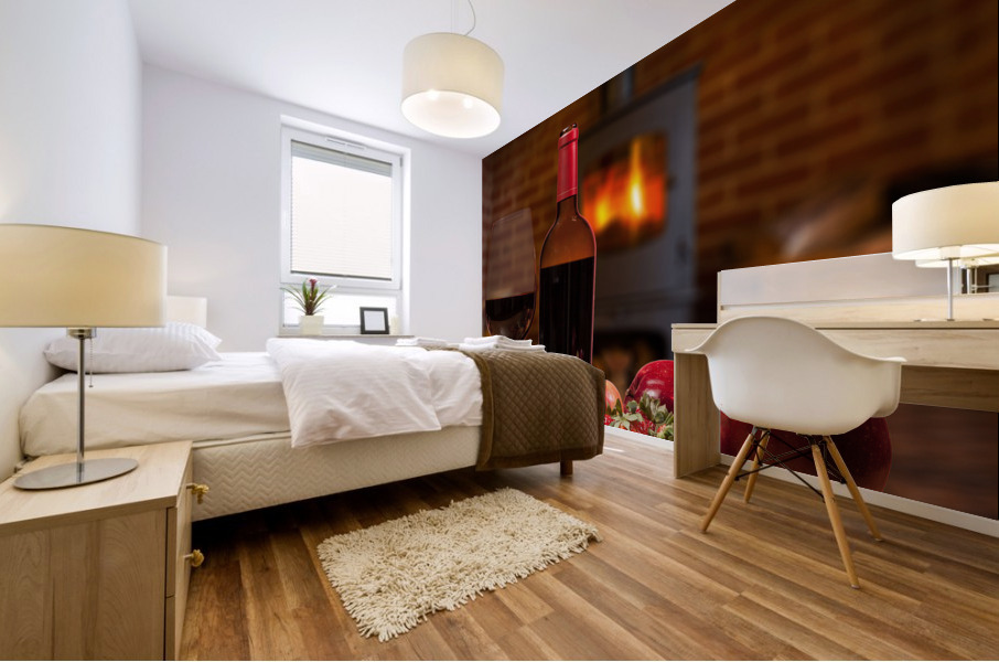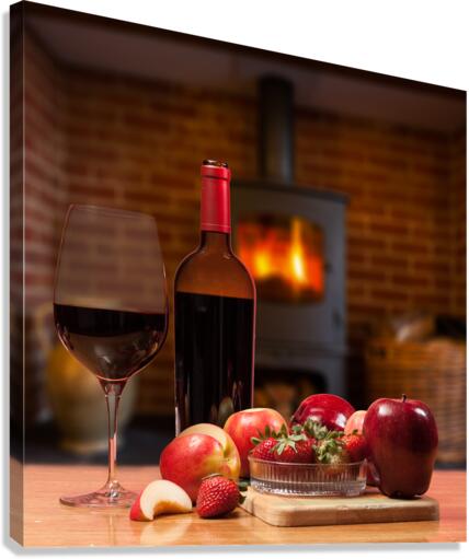 Red wine bottle and red wine in glass with red apples grapes and strawberries in front of roaring coal wood fire in brick fireplace