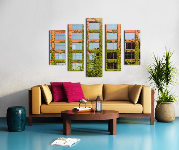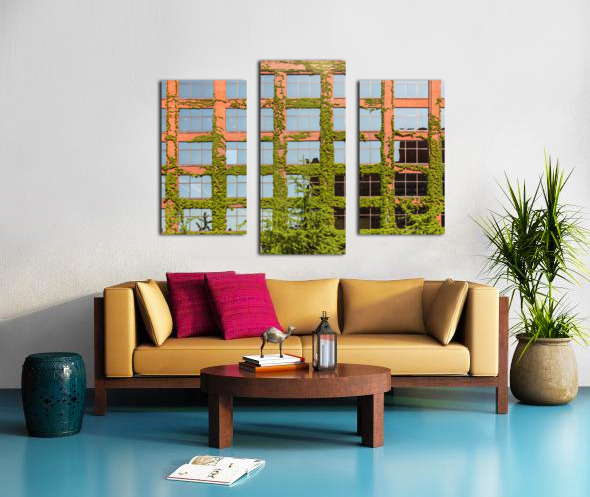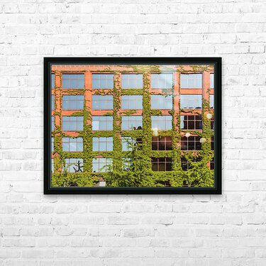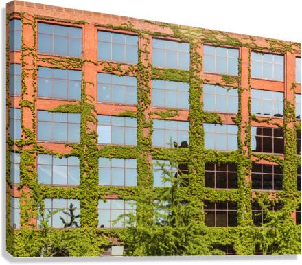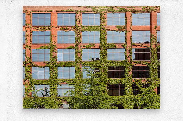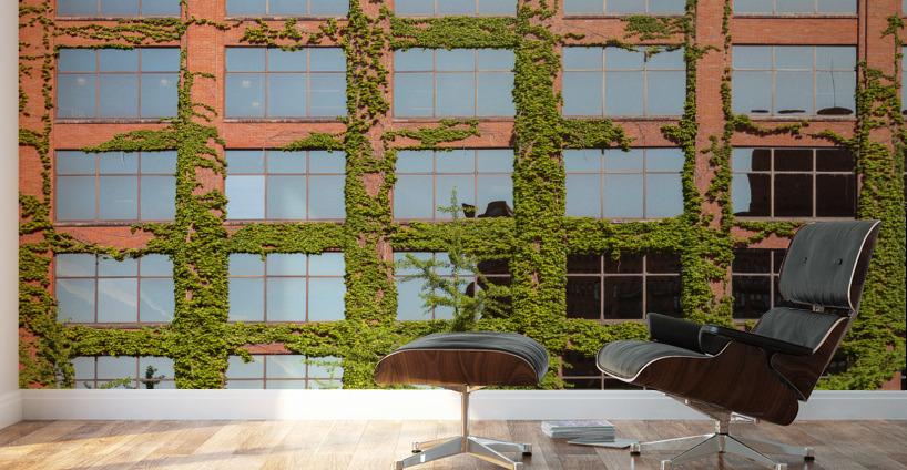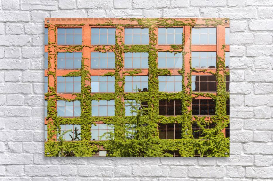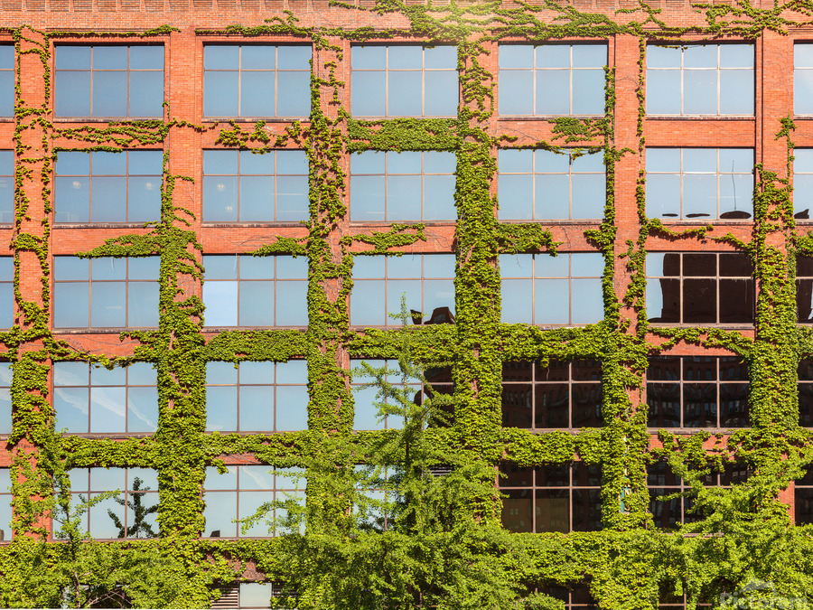 Modern Chicago brick office with green leaves plants and creepers growing around the windows to improve the environment