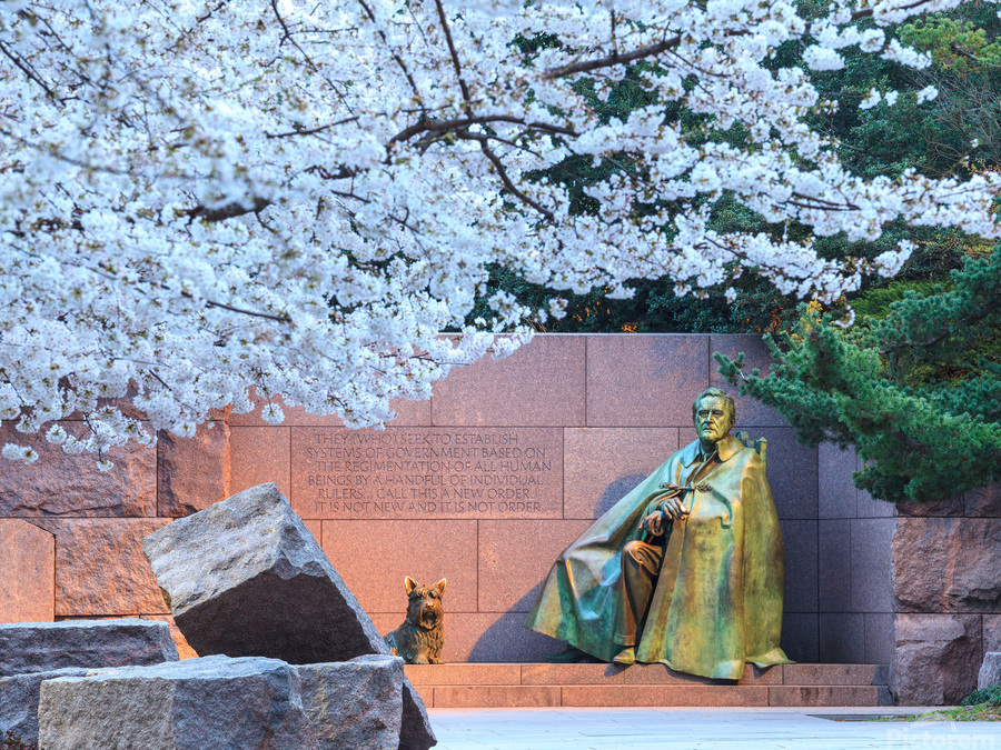 Early Japanese cherry blossoms surround the floodlit monument to Franklin Delano Roosevelt in DC