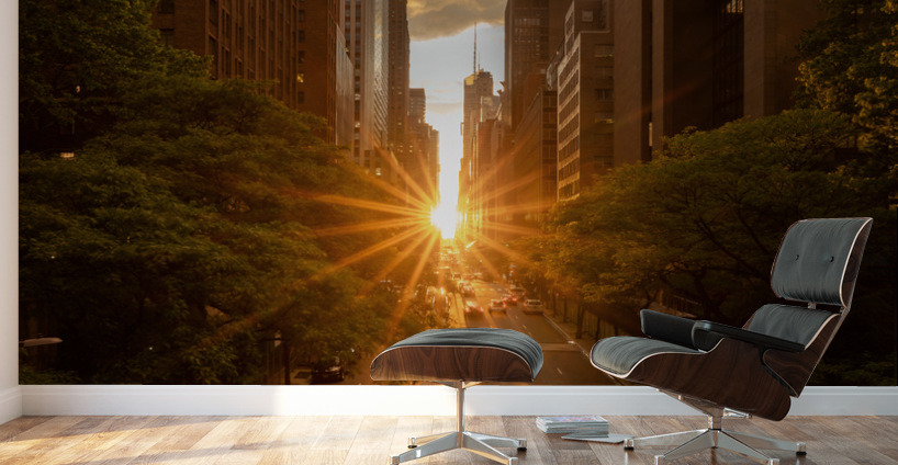 Sun setting along the length of 42nd street in New York city known as Manhattanhenge