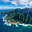 Aerial view of Kee beach and the coastline towards Hanalei on Hawaiian island of Kauai from helicopter flight