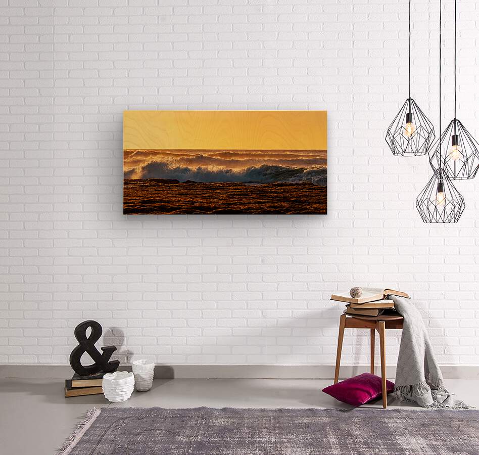 Get this artwork "Setting sun lights crashing waves" in a framed print.