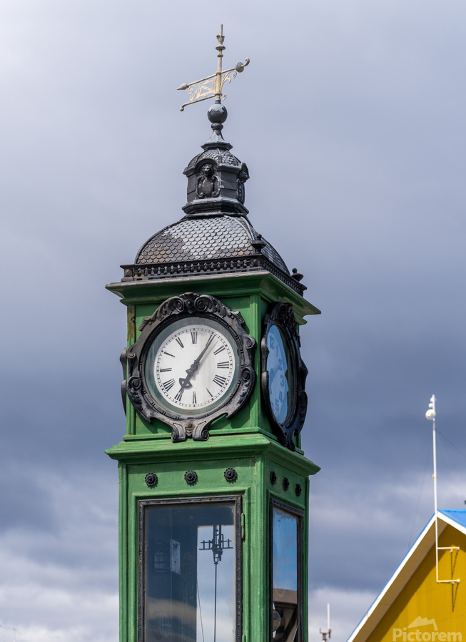 ABOUT THIS ARTWORK: CLOCK TOWER AND WEATHER STATION BY PORT IN PUNTA ARENAS IN CHILE