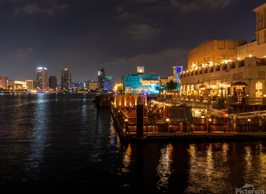 ABOUT THIS ARTWORK: THE CREEK BY BUR DUBAI AND AL SEEF AT NIGHT WITH WATERFRONT REST
