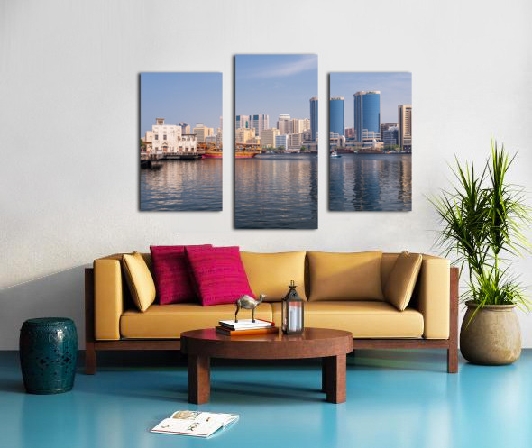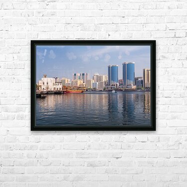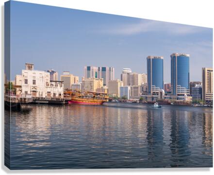 Get this artwork "The Creek by Bur Dubai and Al Seef with large docked cruise boat" in a framed print.