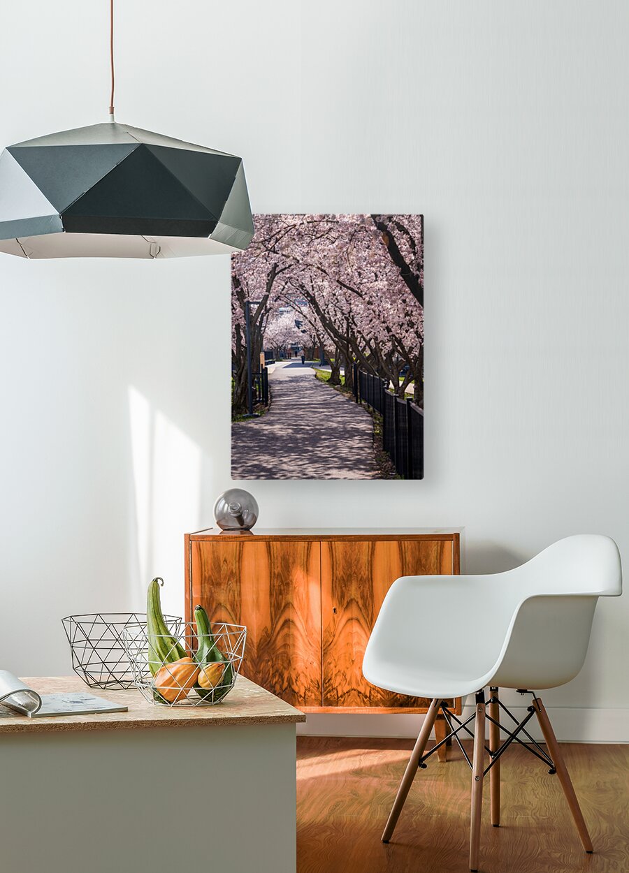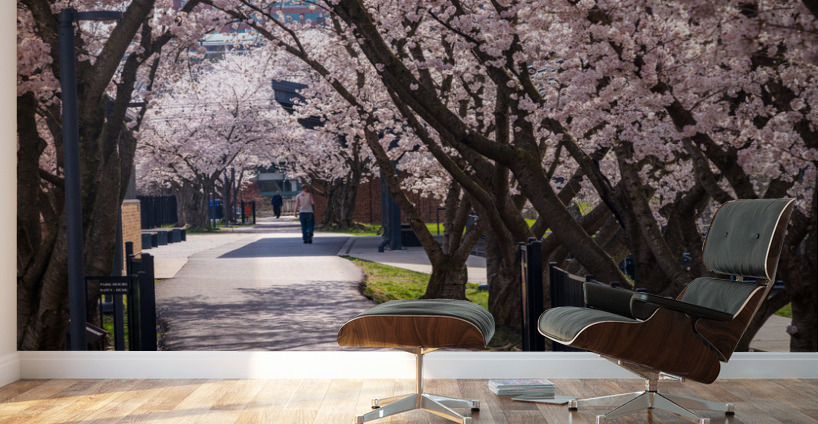 ABOUT THIS ARTWORK: CHERRY BLOSSOMS OVER WALKING TRAIL BY THE RIVER IN MORGANTOWN W