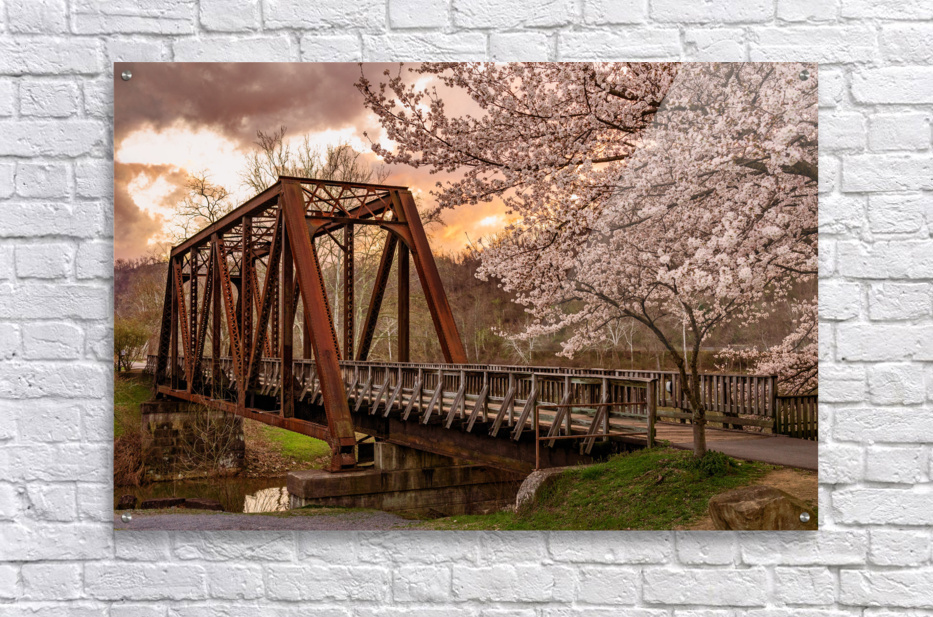 Old steel girder bridge carrying walking and cycling trail in Morgantown WV over Deckers Creek with cherry blossoms blooming in the spring