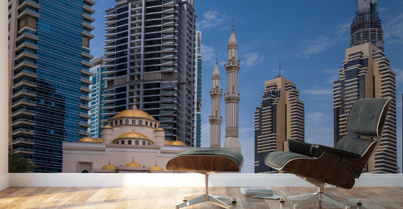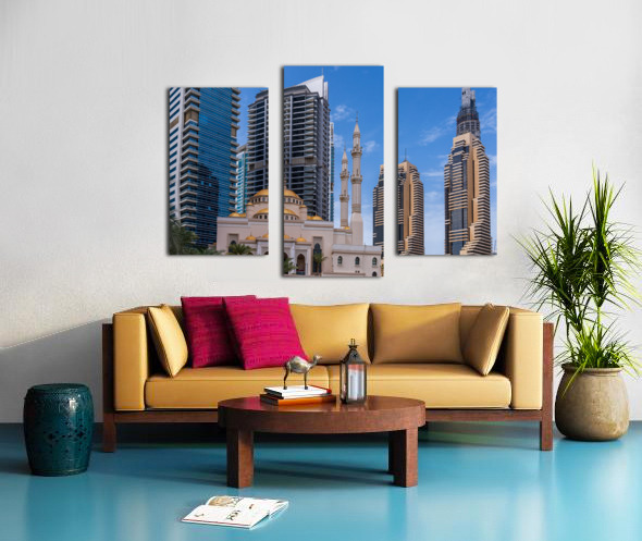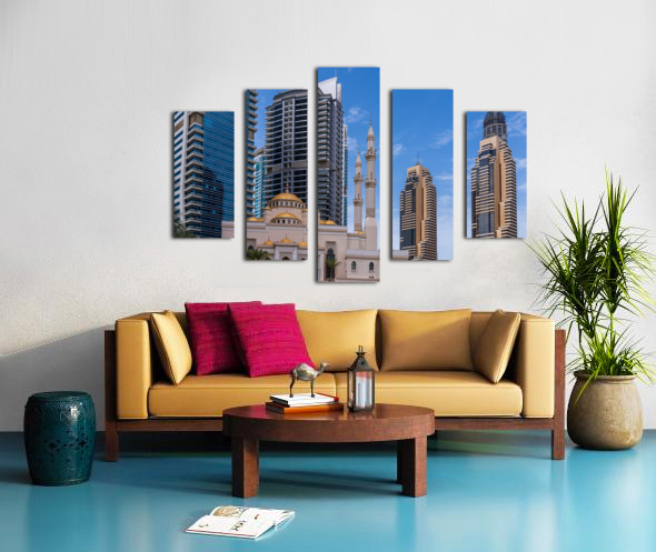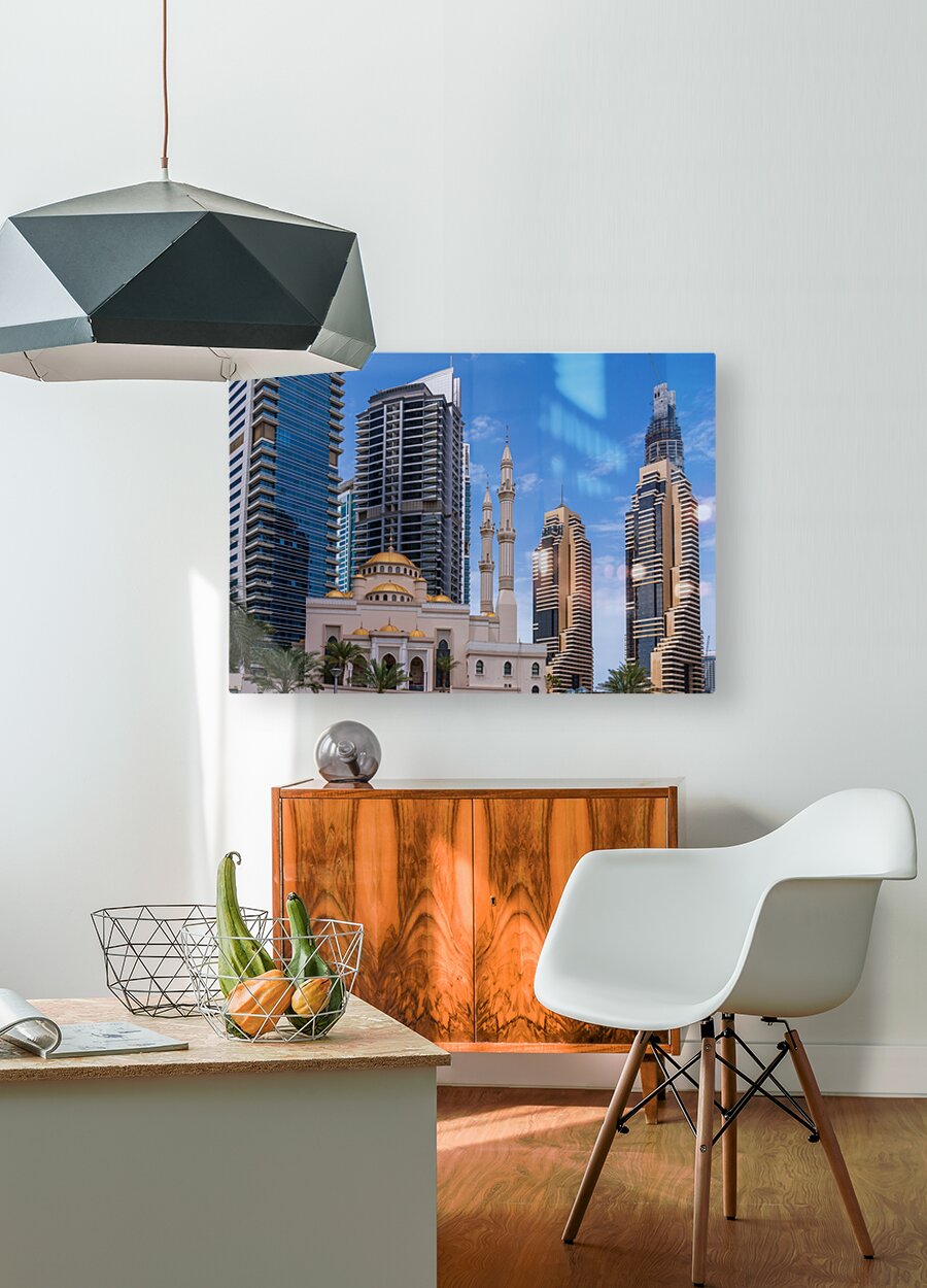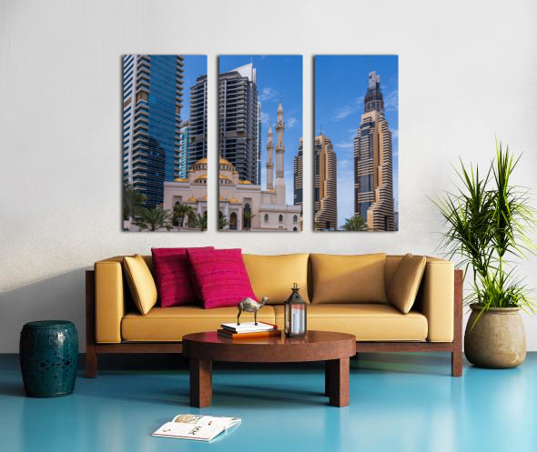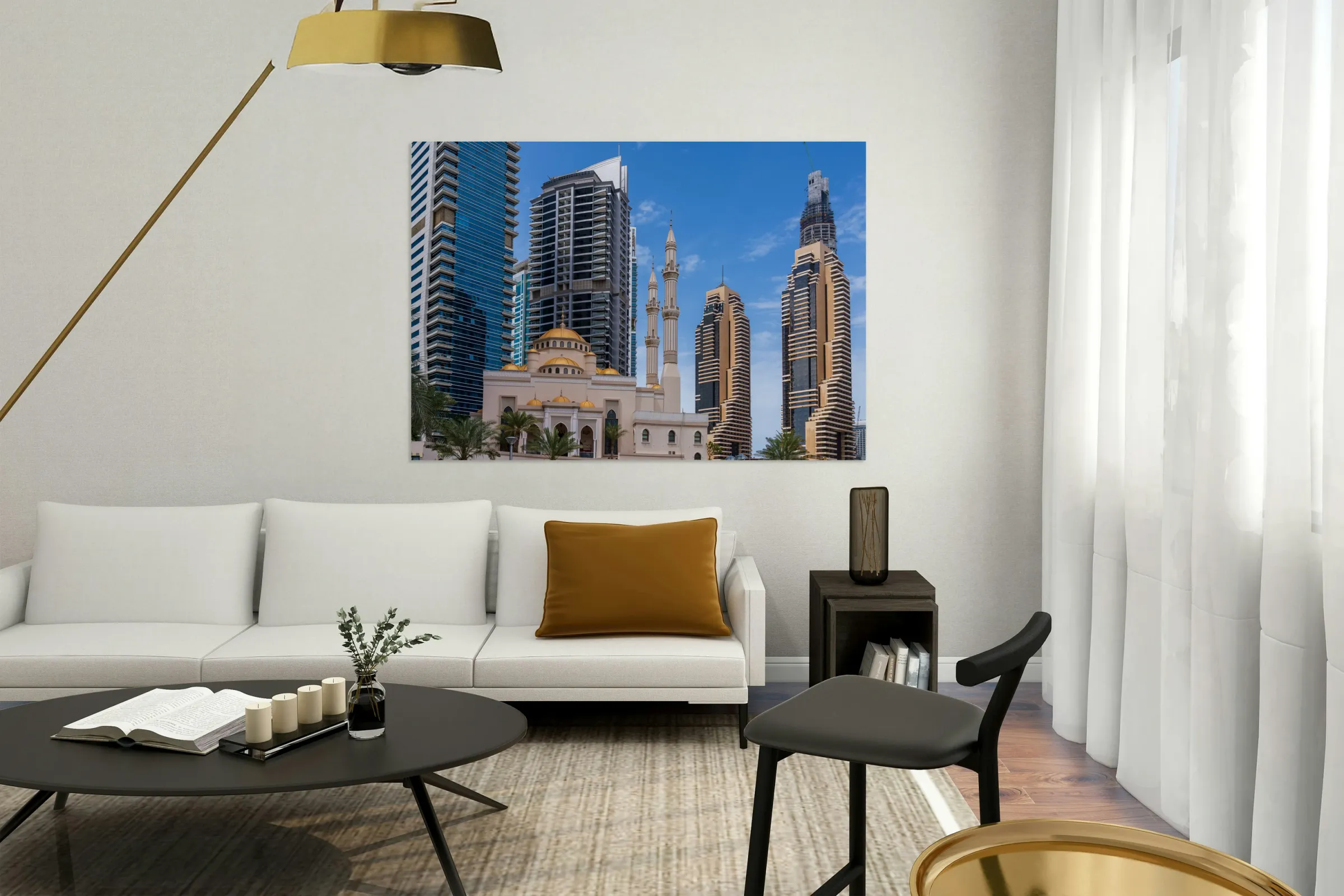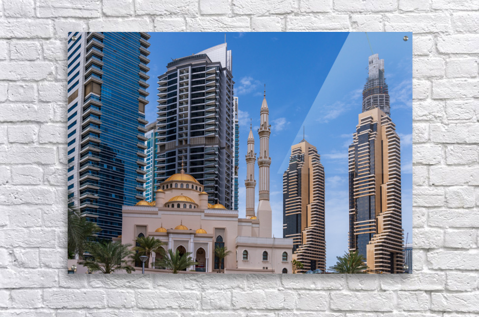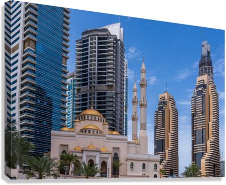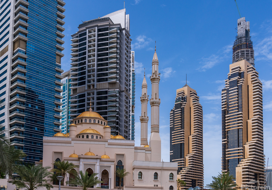 ABOUT THIS ARTWORK: MOSQUE AMONG TOWERS ON THE WATERFRONT AT DUBAI MARINA UAE