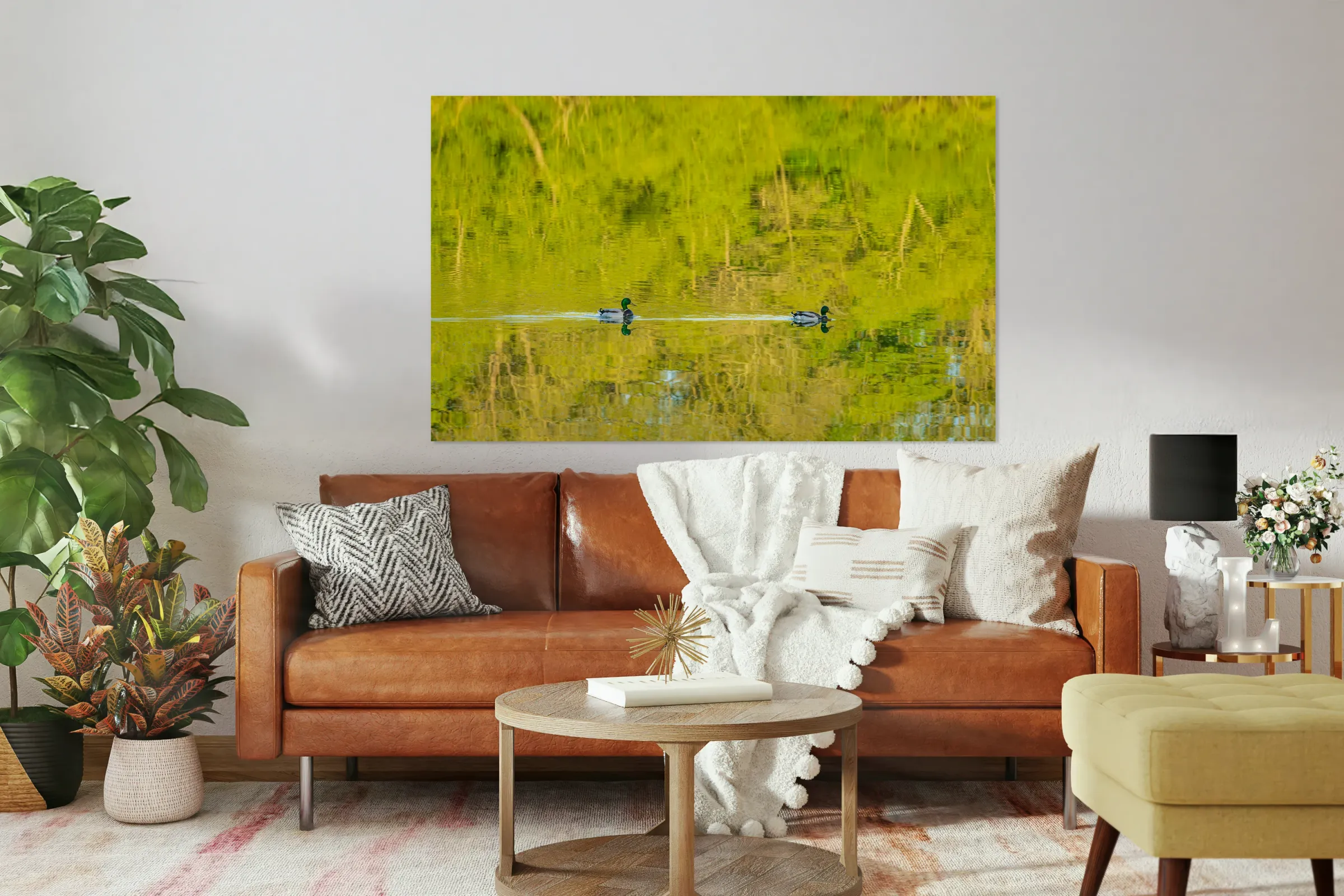 Get this artwork "Two ducks floating through reflection of sunlit trees" in a framed print.