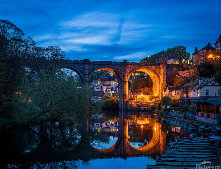 Stone viaduct over River Nidd at Knaresborough with rowing boats by riverbank at night