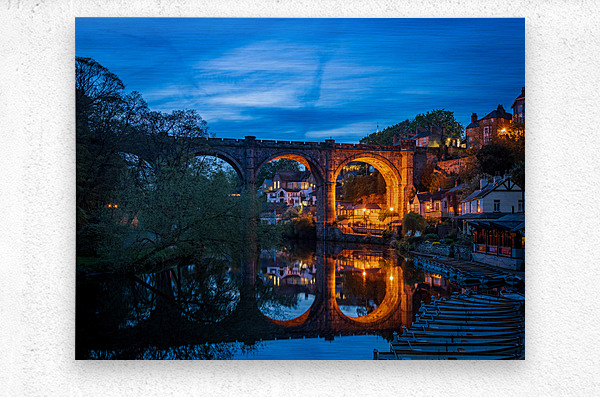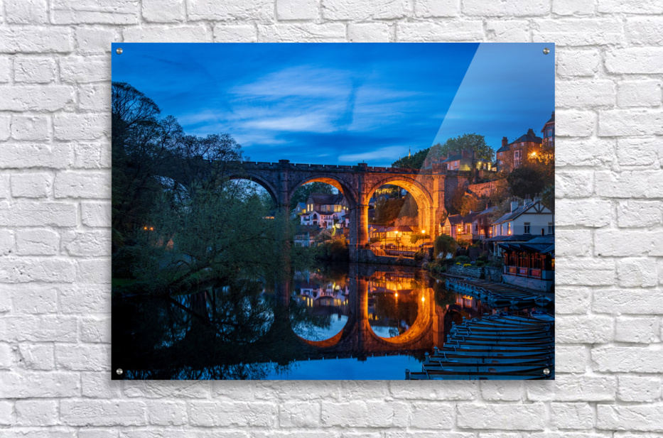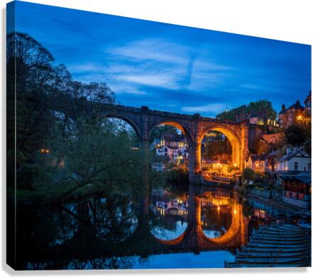 Stone viaduct over River Nidd at Knaresborough with rowing boats by riverbank at night