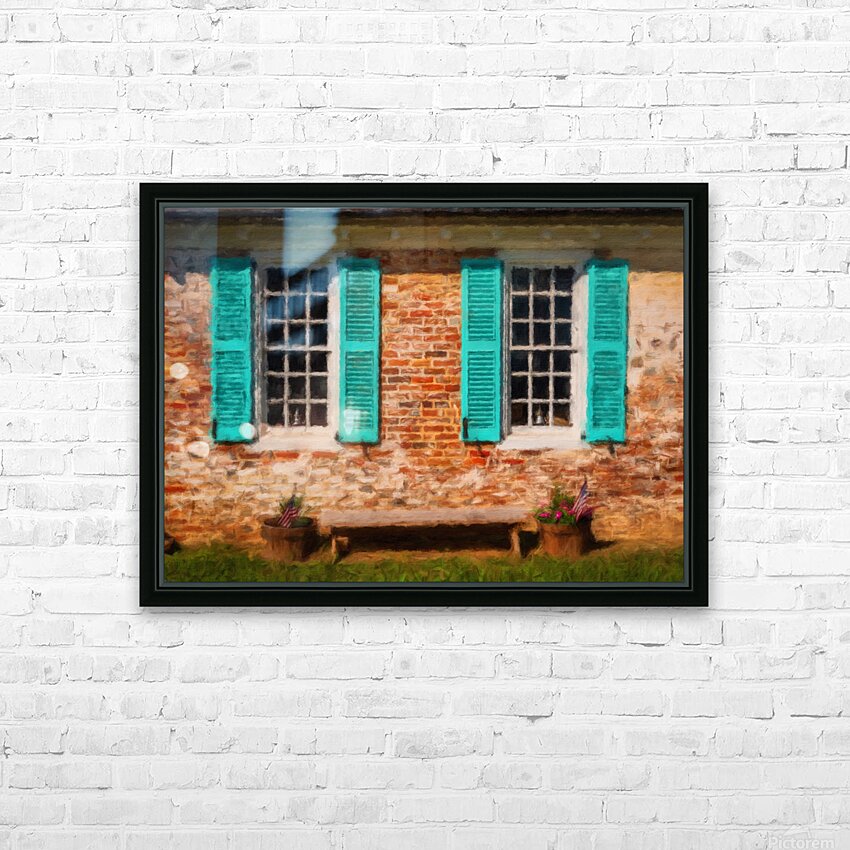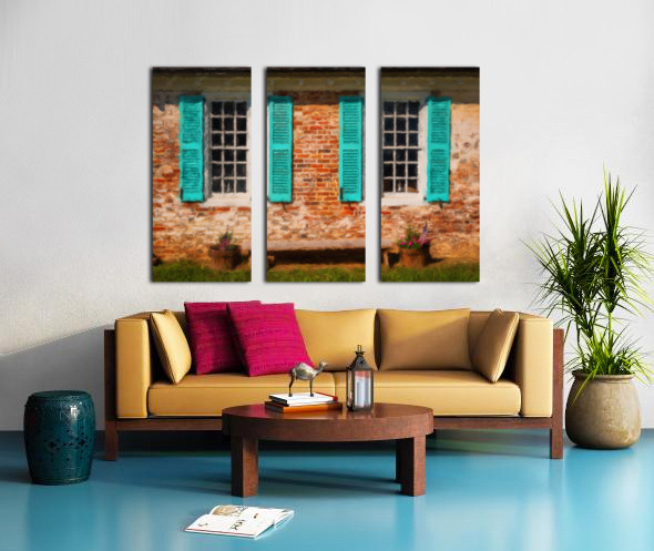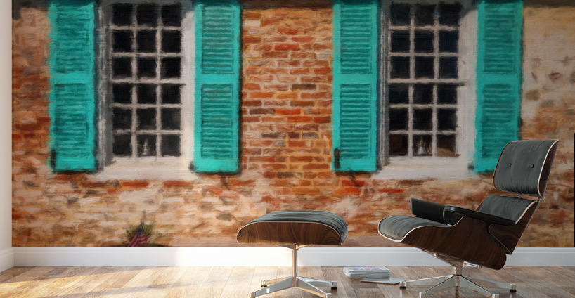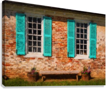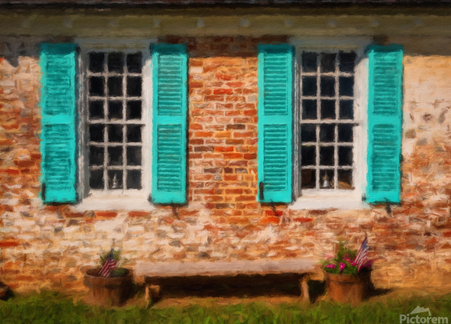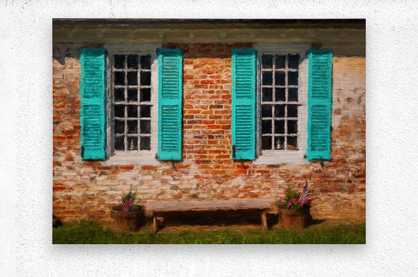 Digital oil painting of simple blue shutters around white windows against a brick wall in colonial house in Virginia