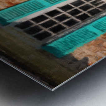 Painting of blue shutters against a white painted brick wall in  Picture Frame Printing