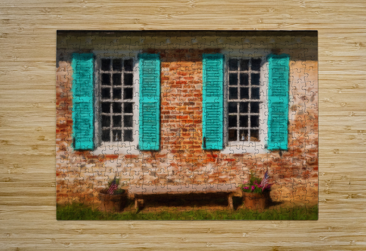 Painting of blue shutters against a white painted brick wall in  Steve Heap Puzzle printing