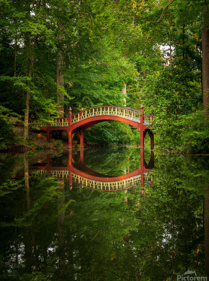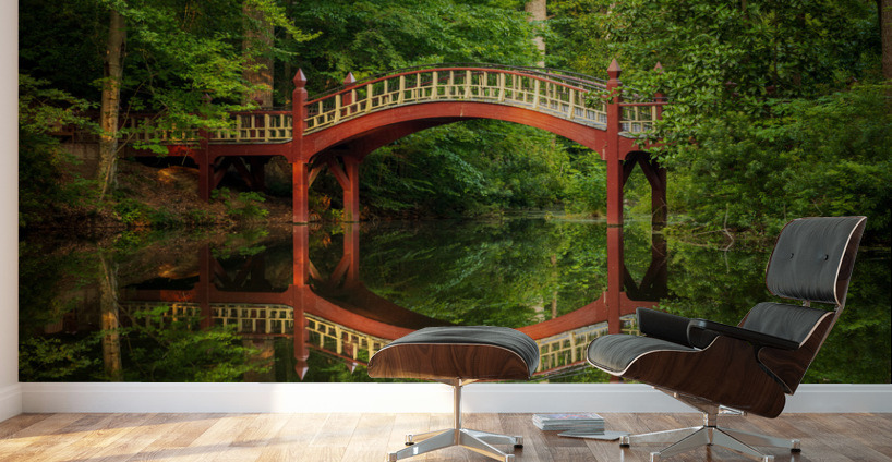 Ornate wooden bridge over very calm Crim Dell pond on campus of William and Mary college in Williamsburg Virginia