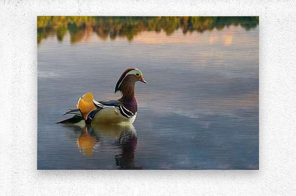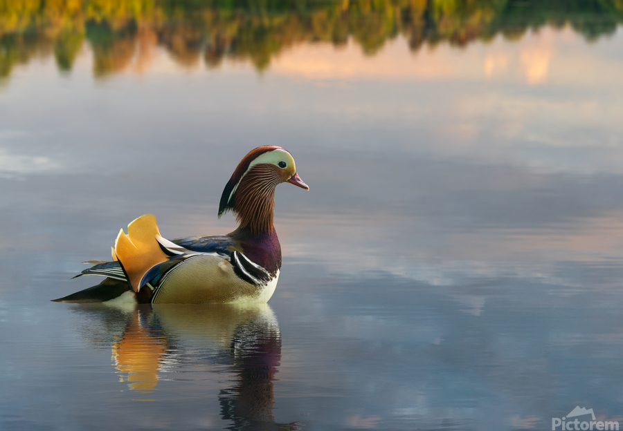 Mandarin duck floating serenely on Ellesmere Mere as the sun sets and reflects the bright clouds in the calm surface of the lake in the Shropshire lake district