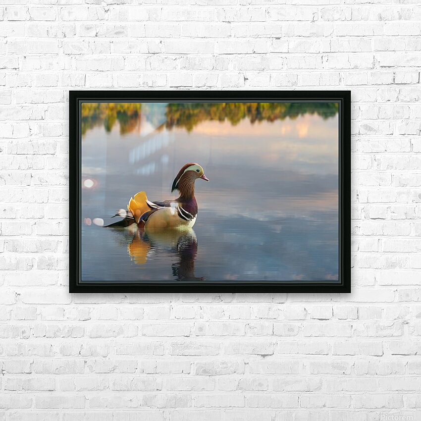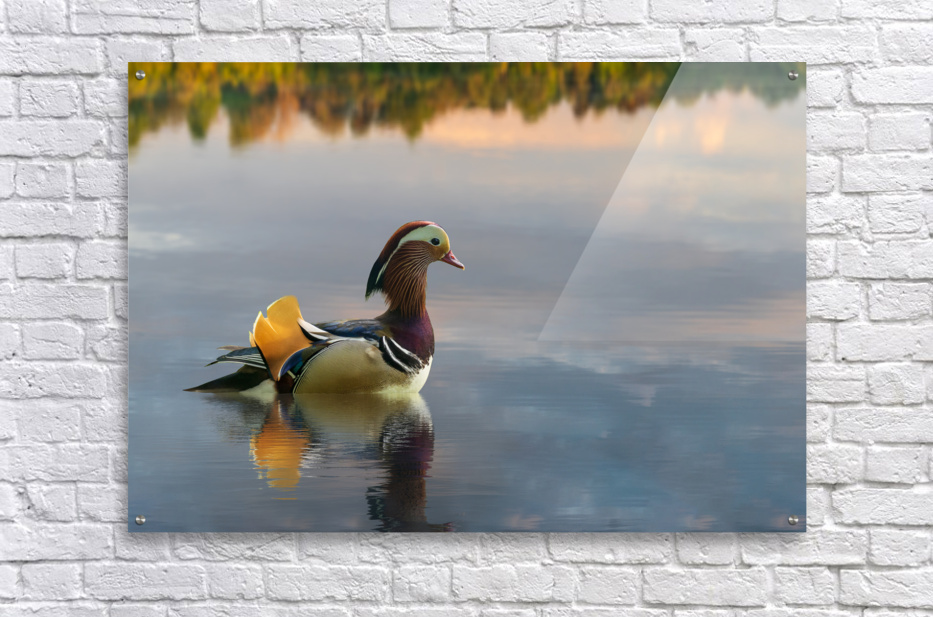 Mandarin duck floats on Ellesmere Mere to a clear reflection of  Picture Frame Printing