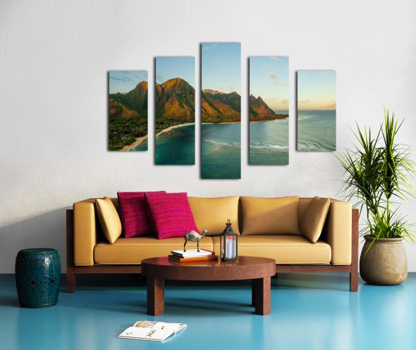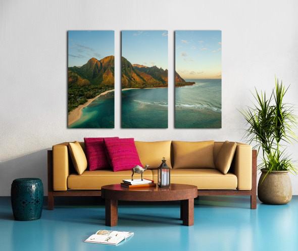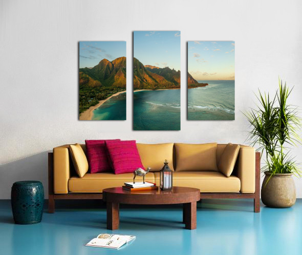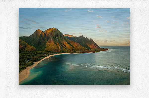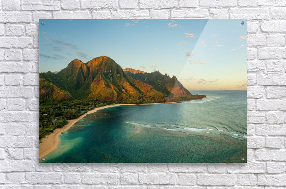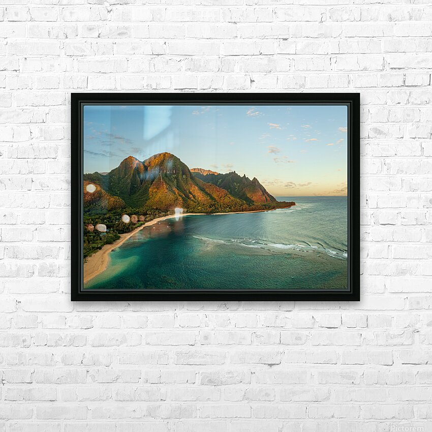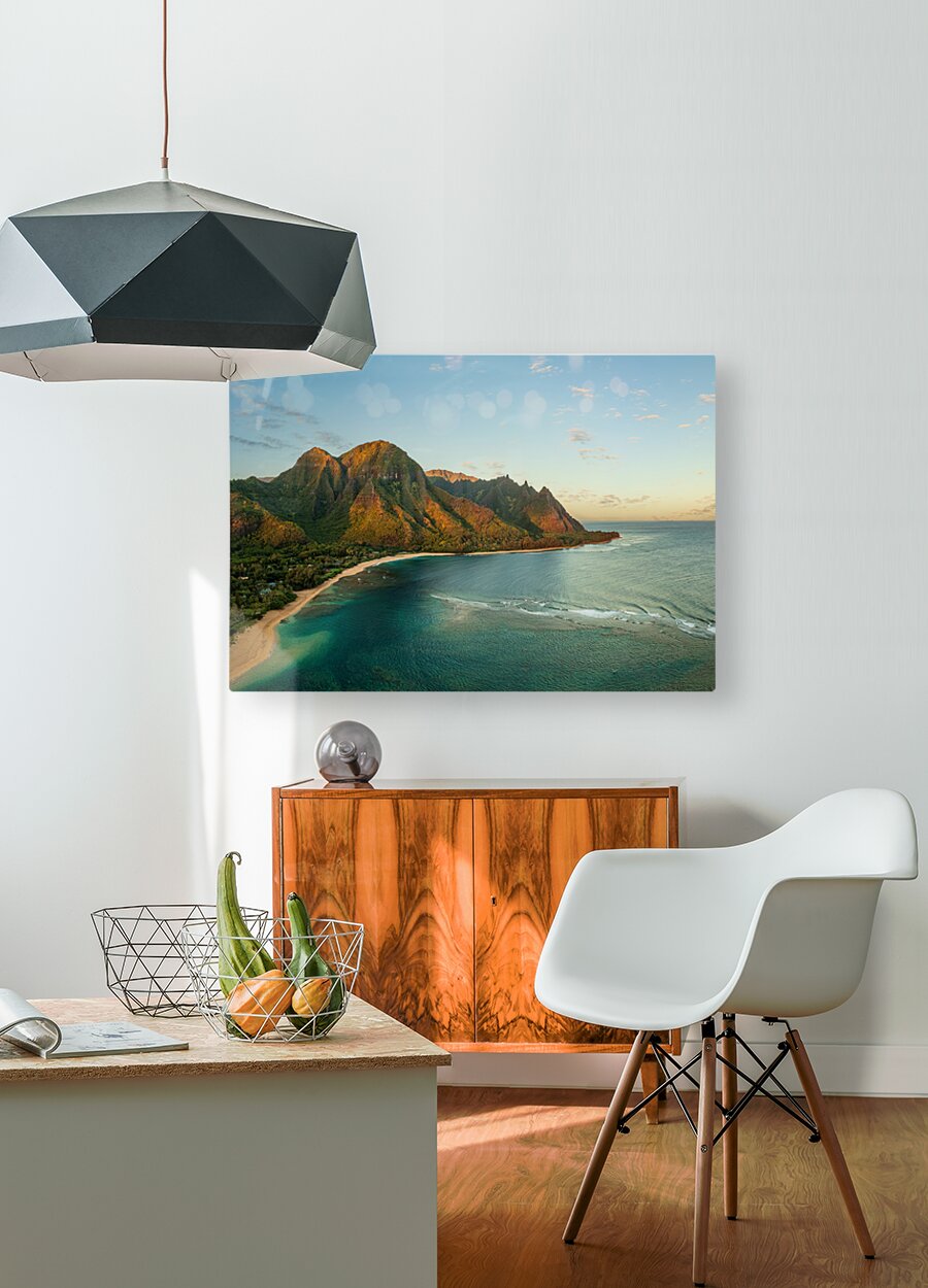 Get this artwork "Aerial drone photo of Tunnels Beach at sunrise on Kauai in Hawaii" in a framed print.
