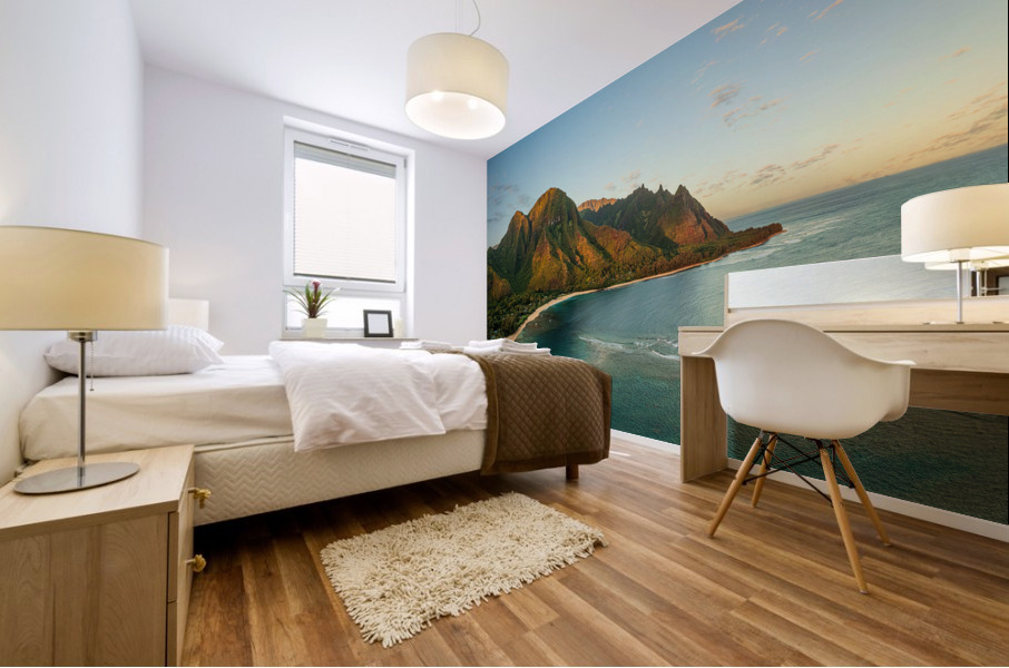 ABOUT THIS ARTWORK: AERIAL DRONE PHOTO OF TUNNELS BEACH AT SUNRISE ON KAUAI IN HAWAII