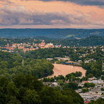 Cityscape of the cities of Granville and Morgantown in West Virginia at dusk with interesting sunset lighting the sky and reflecting in the river